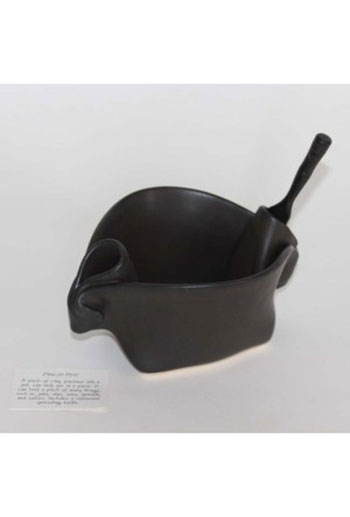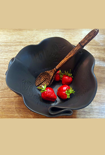 Starting with layered clay slabs, Nancy folds, sculpts, and twists the clay to achieve beautiful fluid designs. Finished with a beautiful matte black glaze these pieces are food safe, as well as microwave, oven and dishwasher safe. Food makes a striking presentation when served on these pieces!