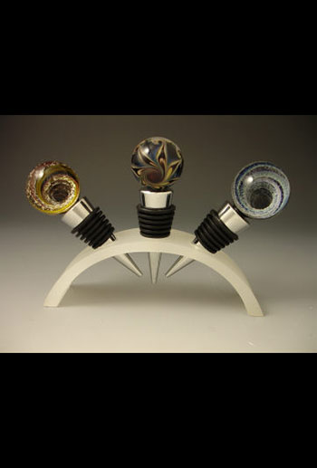 Filip’s functional kitchen ware and tumblers are blown from Pyrex, so they’re dishwasher safe. His vortex wine stoppers are blown in vibrant colors spiraling to create this optical illusion of depth.