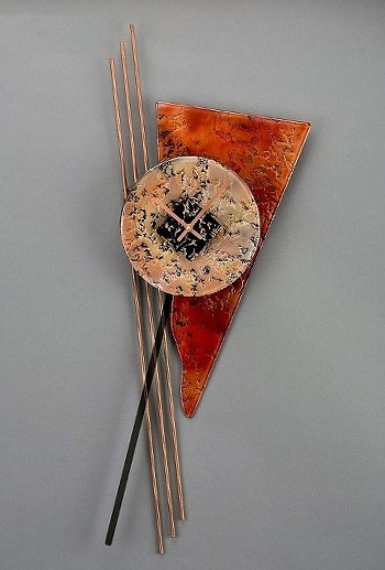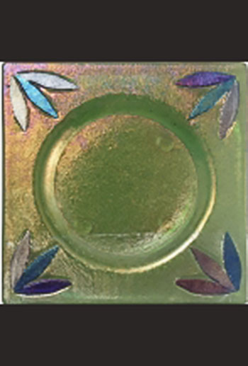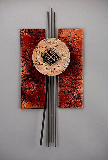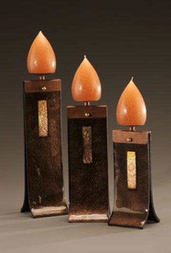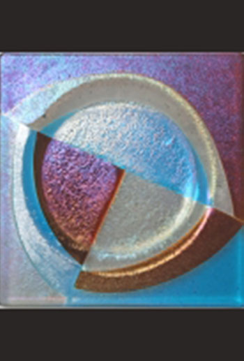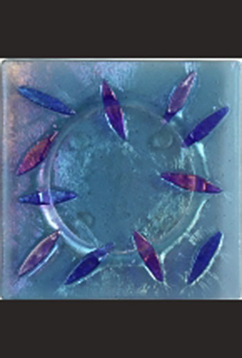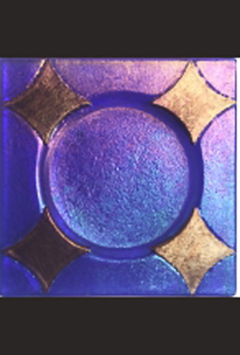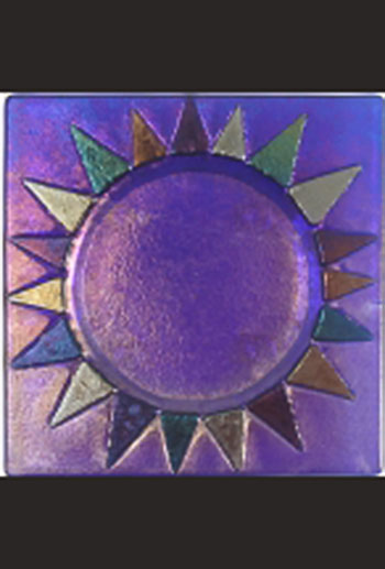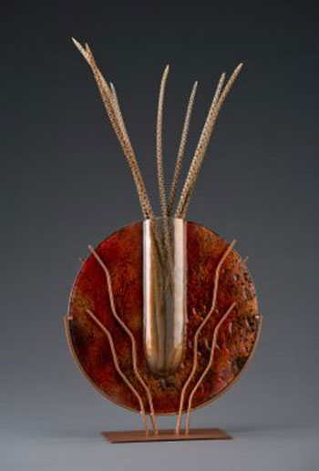 Mark’s unique process involves firing glass over a bed of sand, resulting in a beautiful organic textured look. He then applies a copper enamel and fires the piece a second time. At 2,000 degrees the copper evolves into a striking ruby red color which shimmers in the light.