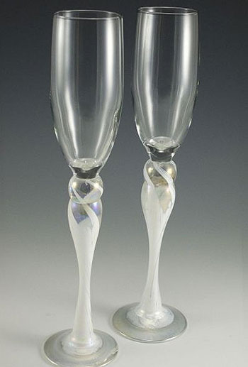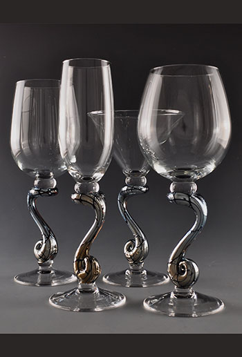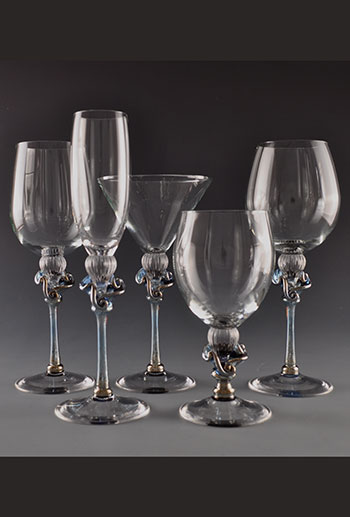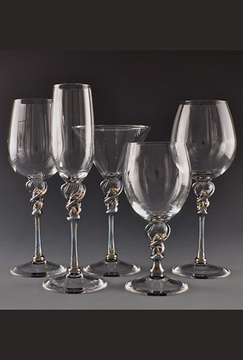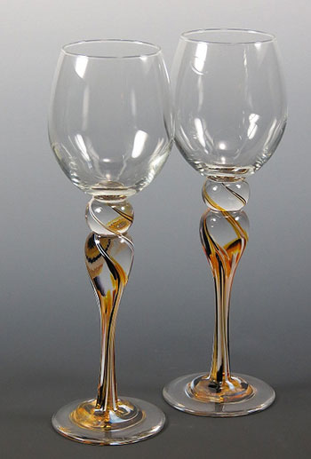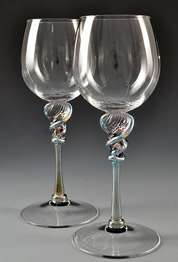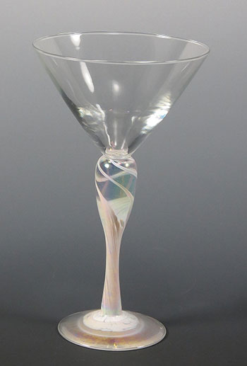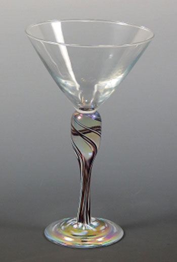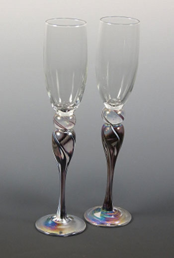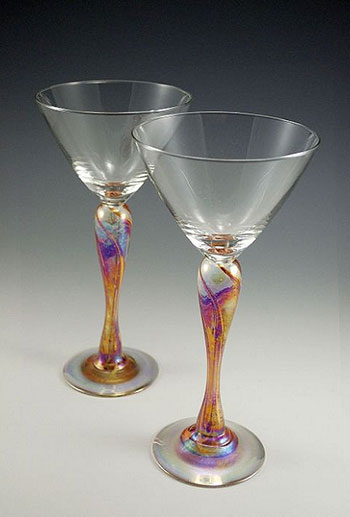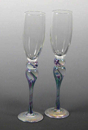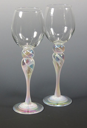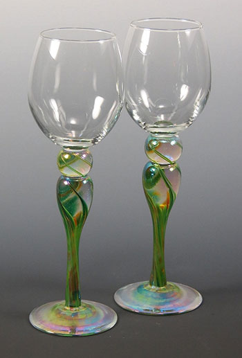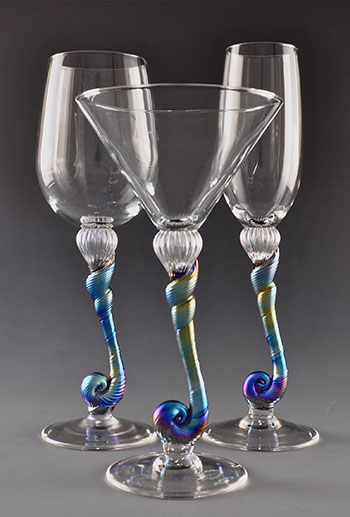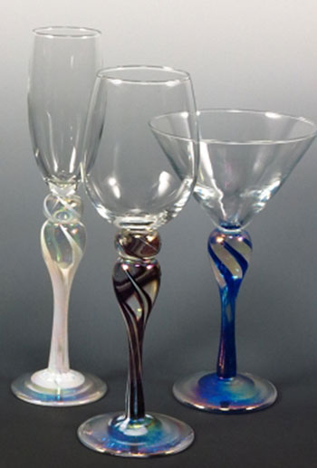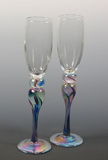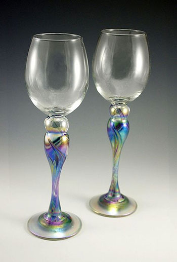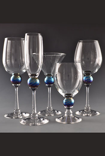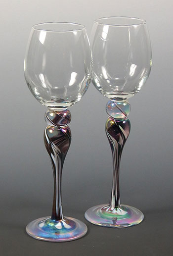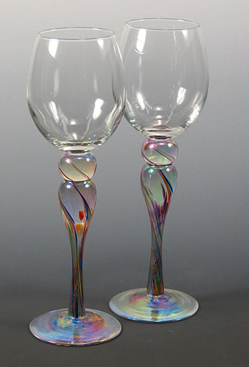 These colorful, iridescent, blown glass stems with clear glass cups will be the center of attention at any table or gathering.