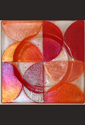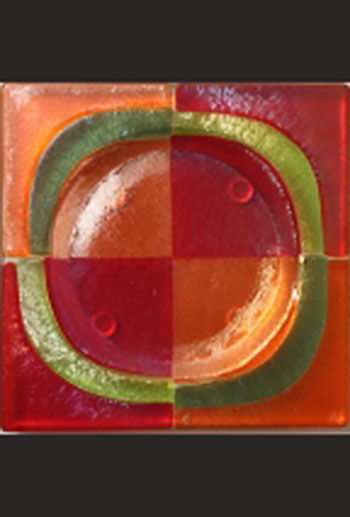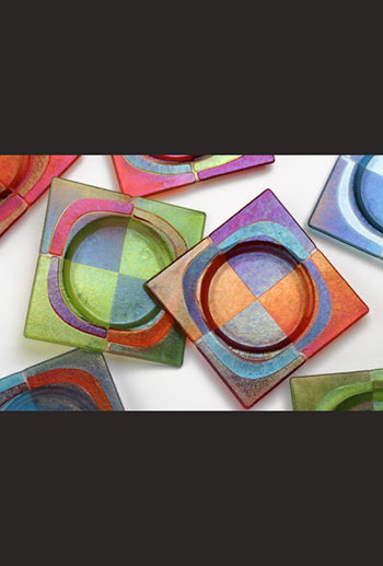Marianne Shepardson kiln fires glass to strengthen it, then cuts and layers different colors, and finally fires the glass pieces a second time to slump the creation over a mold. The end result is a beautiful wine coast to protect your counter top or table from that nasty red wine circle.