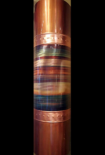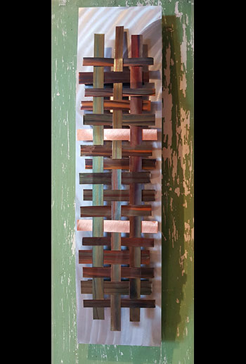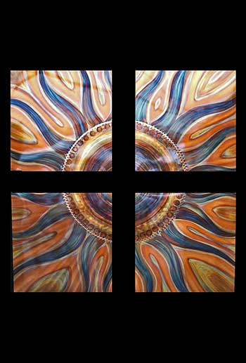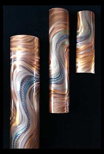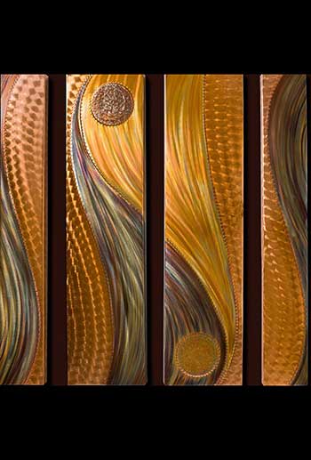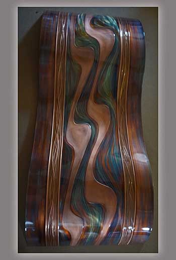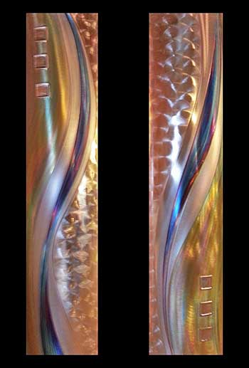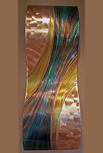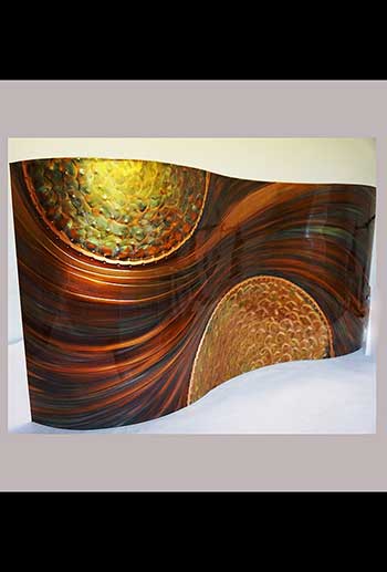 The Hedblom’s copper wall sculptures are hand hammered, formed, textured, & flame painted using numerous gases & torch tips. The colorations are achieved from heat & buffing techniques that create deep, flowing designs often described as holographic & three dimensional. There are no chemicals, acids or paints used in the coloration process. Each piece is sealed with a very durable clear coat finish, to insure lasting beauty and UV protection.