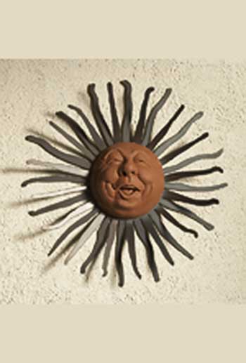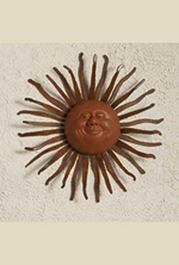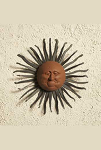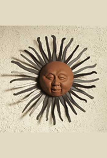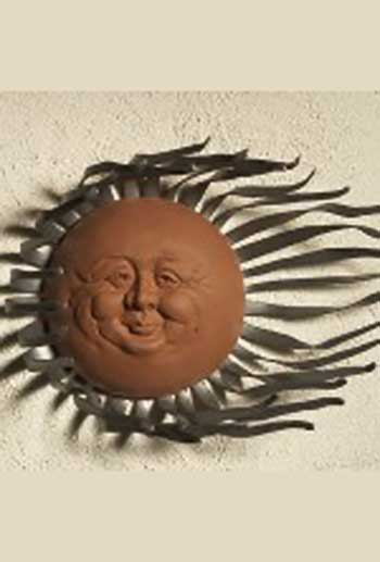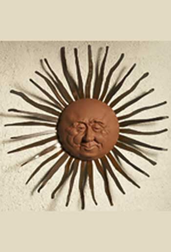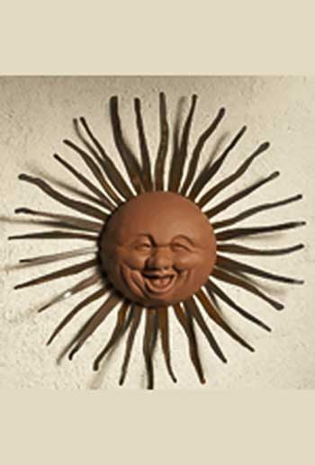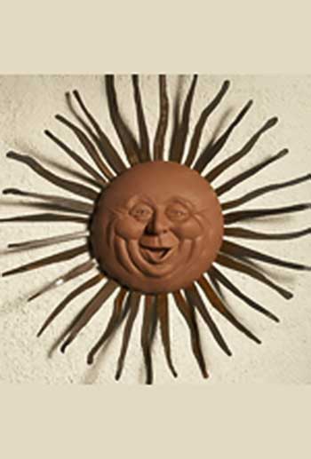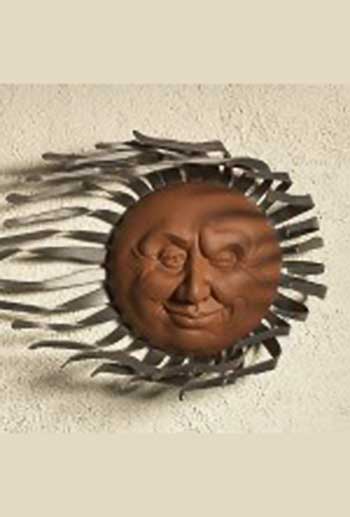 Chris and Karen Montgomery create whimsical sun faces cast in dyed cement. The pre-rusted rays are cut out of 14 gauge steel and are finished with a clear coat sealant to protect the steel. These pieces will bring a smile to your face and brighten up any garden or outdoor living area.