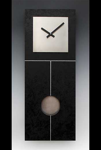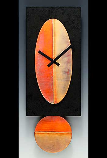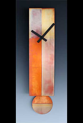 For over 25 years Leonie has created her clocks using the warm approachable palette of colored patinas on copper and nickel coupled with wood. Using the basic shapes of circles, squares, ovals and rectangles these clocks are not only beautiful but playful. Many designs utilizing a subtle “hide and seek” pendulum.