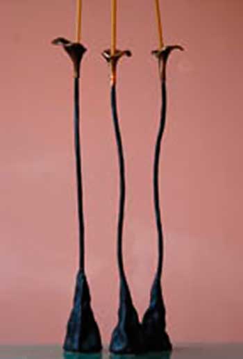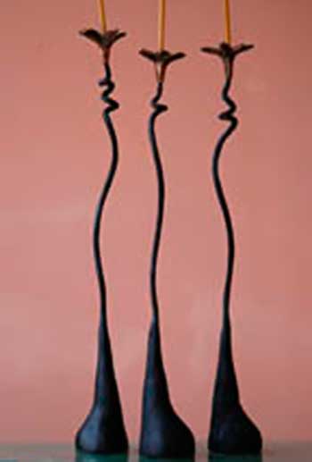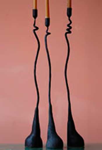 Hand-forged iron lamps and candleholders made by this husband and wife team. Luis bends and twists the iron into fluid designs that are light and lyrical. Loren creates exquisite shades from gorgeous handmade paper.
